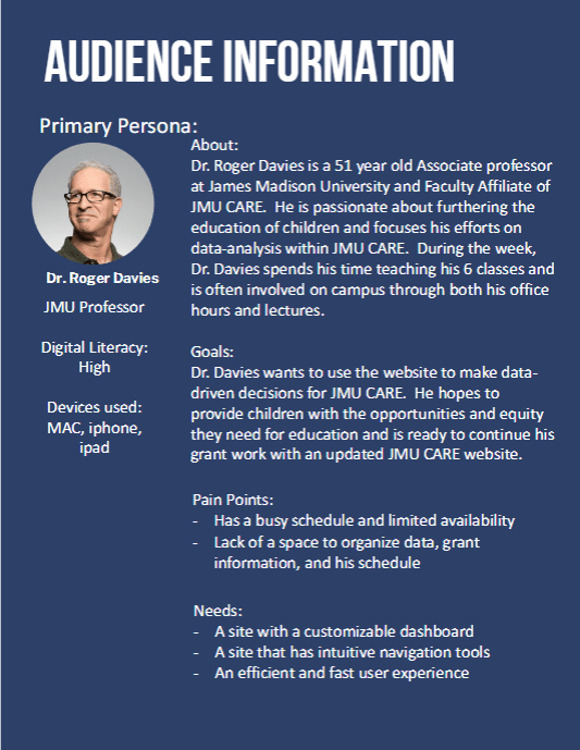 In the initial stages of creating user personas for the faculty of JMU CARE, I employed the use of ChatGPT and other AI models to select realistic pain points and user needs that the staff may encounter. I further developed the personas by conducting in person interviews that focused on assessing their current frustrations, needs, and involvement with JMU CARE.