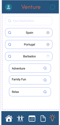 Below are some examples of my UX/UI work for an application design: Venture. I worked on a student team of fellow user experience and product designers at JMU to create a functional travel app prototype. Our app was designed to serve as an all-in-one destination planning, booking, and travel sharing space for iOS.